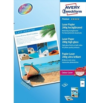 Carta fotografica patinata lucida Premium Avery. Adatta a stampanti laser: