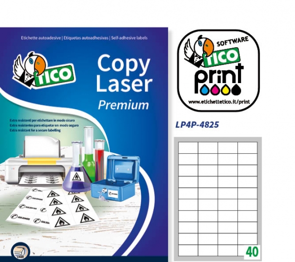 Etichette adesive in poliestere (PET) bianco opaco. Adatte a stampanti laser b/n: