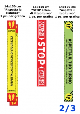 Kit di adesivi pre stampati con indicazione dei presidi di protezione individuale e fasce calpestabili per la segnalazione delle distanze di sicurezza.